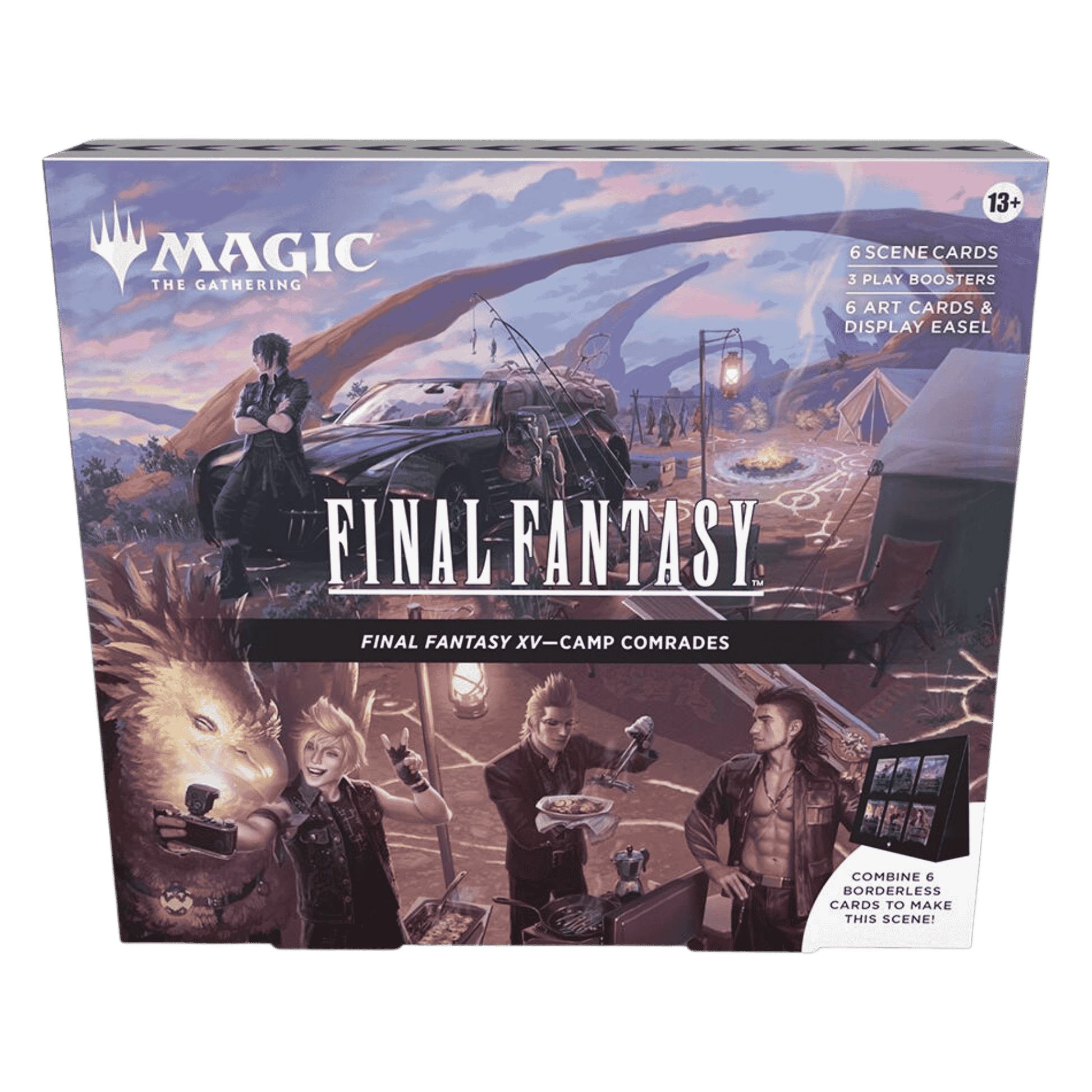 | Rules Text Contains: | This Magic: The Gathering—FINAL FANTASY Scene Box, Camp Comrades, contains 6 traditional foil borderless scene cards, 6 Art-Only scene cards, 3 Play Boosters, and a paper display easel. Each Play Booster contains 14 Magic: The Gathering cards, including 1–4 cards of rarity Rare or higher, 3–6 uncommon cards, 6–9 common cards, and 1 land card. One card of any rarity is traditional foil. The land card is also traditional foil in 20% of Play Boosters. This product does not contain a Golden Chocobo card (available in English-language Collector Boosters only).